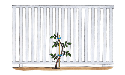 伸ばしていたつるを横に倒すようにして、フェンスに結び留めて誘引する。フェンスの面に空いた場所がないように、均等につるを配るのが理想的。