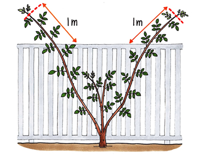 6. フェンスの高さ、幅ともにほぼつるで覆えるようになったら、株元からのつるを出すようにしてやると、花が咲いたときの密度が高まります。 なお、早く花でいっぱいのフェンスにしたいときは、市販の3年生ロング苗、あるいは長尺苗を入手して植えるとよいでしょう。