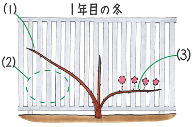 フェンスの下部にも花を咲かせたいときは、下部の下方のつるを横方向に伸ばすようにする(3)。