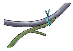 3.つるが伸びてきたら、ゆるい螺旋状を描くようにして、つるを上に巻きつけていく。ただし、主枝にする太いつるはあまり曲げようとせず、自然に伸ばすようにするとよい。