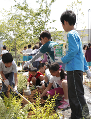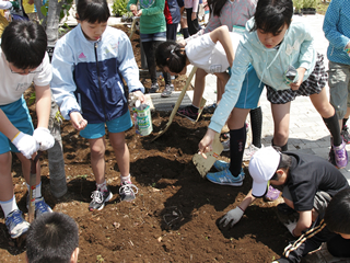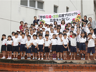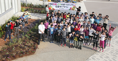 2012年に開校した新しい学校です。花壇の整備までなかなか手が回りませんでしたが、校庭の花壇をきれいにしたい!と、保護者のみなさんにもお手伝いいただき、5・6年生が花育キャラバン隊と一緒に花壇づくりに挑戦しました。