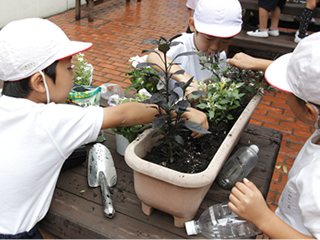 班ごとに、花の色や背丈を考えながら土を耕し、肥料を与えて花壇にいろんな花を植え付けました。
