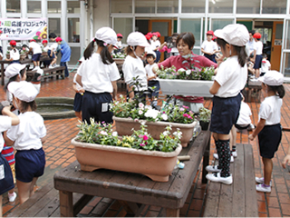 本校には真ん中を小さな川が流れるレンガ造りの中庭があります。ウッドテーブルと椅子もあるので、そこで彩り豊かな草花を栽培して子どもたちのオアシスにしたいと思い、花育キャラバンに応募しました。敷地には公園が隣接し、畑や小さな実験水田もありますが、1年生から自分で花や野菜の種まきをしたり、植物の成長を観察しながら生命を身近に感じることで、興味や好奇心が大きく育ってほしいです。生き物と関わりながら子どもたちの心に優しさを育てる花育は、低学年からできる有意義な活動だと思います。