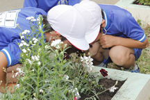 低学年の児童が、ミニトマトの苗に水をあげながら「ミニトマトさん、早く大きくなって、おいしい実をたくさんつけてね」と優しく話しかけていました。この姿こそ育てていきたい感性です。子どもたちも、水やりな どの世話をしながら、日に日に成長 していく草花や野菜などを観察したり収穫することがたまらなくうれしいようなので、それらの機会を多くつくって大いに味あわせてあげたいです。今回の花育を通して、植物への好奇心を切り口に、子どもたちの「もっと詳しく知りたい!」との意欲形成につながるとうれしいです(校長先生)。