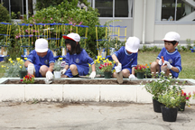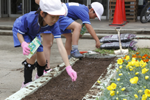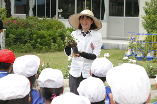 小規模校である学校の事情に合わせ、効率的なメンテナンスで植物の魅力を最大限発揮できることも特長のひとつ。当日は、4 年生が午前中に花壇の土づくりを、午後からその花壇に 1 年生がアンの庭の植物を植えて完成させる、 というリレー作戦。物語に出てくる実際の植物を 1 年生と植えていると、みんな口々に植えている中で好きな花を教えてくれました。