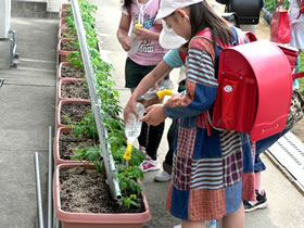 チューリップ、ひまわり、ミニトマト、へちま、ひょうたん、かぼちゃ、あさがお、じゃがいも、さつまいもなどを学年ごとに植木鉢や学習園で育てています。