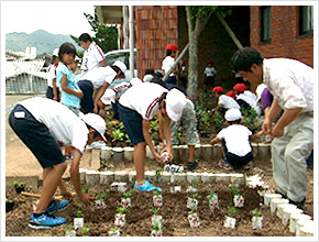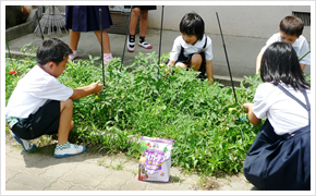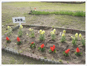 全校児童でサツマイモを栽培しています。他に、中庭、玄関前にいくつも花壇があり、季節の花苗を環境委員会の児童が植えてお世話をしています。