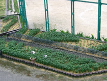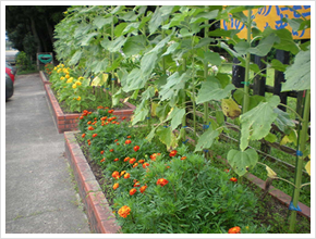 肥料が届いたときには、すでに野菜は殆ど収穫期に入っていましたので、これからますます暑くなる夏に向けて、グリーンカーテンの栽培に役立てたいと思います。 緑化委員会は、年間を通して活動をしていますので、秋植えの花の苗、球根の栽培に大いに使わせていただきます。 横浜市内の学校ですが、高台にありますので、都会では珍しく緑が多く自然に恵まれています。秋になると、何種類ものドングリが実をつけ、ドングリゴマ、ヤジロべエなど、ドングリを使った工作も楽しむことができます。ドングリの林を子ども達は、ドングリ山と呼び、秘密基地づくりも盛んです。クヌギの実を植えて育て、緑を増やす運動に参加したこともあります。 困っている事はグラウンド側の花壇は、風が強く、またグラウンドからの砂埃で管理が大変です。また校舎裏の花壇は、木の上から常にカラスが狙っていて、花壇の周りにネットを張り、鳥追いテープを付け、人間とカラスの知恵比べです。 また校舎裏なので、日照時間が短く、ホウレンソウの種もまきましたが、うまく育ちませんでした。葉物はやはり難しいですね。