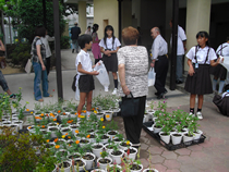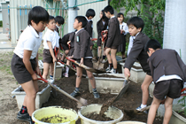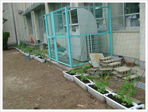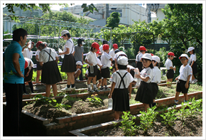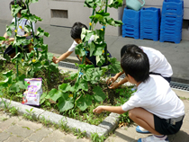 本校には栽培同好会というのがあり、3年から6年の希望者が入っており、毎週水曜日に地域の方たちといっしょに活動しています。都会の学校で土地が少ないので、植木鉢やプランターなどを利用して育てています。また、学校に特別に予算配置されているわけでないので大変です。肥料は同好会で育てている植物や学年の花壇で使わせていただきます。