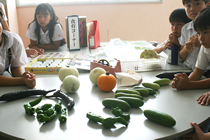 学校菜園でさつまいも・じゃがいも・ちんげんさい・きゅうり・赤ジソ・ミニトマト・えだまめ・いんげん・メロン・うり・なす・へちまなど