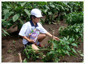 学校の限られた予算では、肥料にお金をかけられず、できる野菜が小さかったが、頂いた肥料のおかげで、大きな花や実をつけるようになり助かっています。困っている事は天候に左右されること。せっかくの収穫前に、カラスなどに食べられてしまうことです。