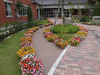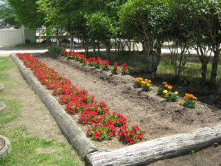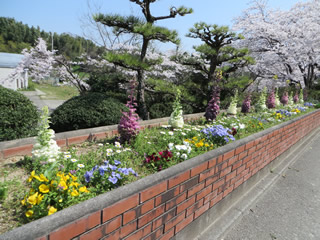 花壇のたくさんある学校です。サフィニア、サルビア、ポーチュラカ、ひまわりなどを植えたいです。春はビオラとパンジー、菜の花、葉ボタン、シクラメンなどが咲いています。花いっぱいの学校にしたいと思っています。