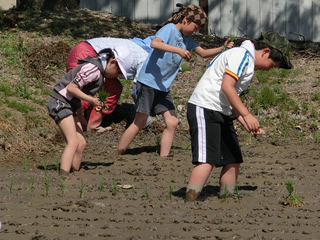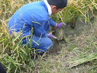 毎日ではないですが、草取りや花殻取りの世話をします。畑や田んぼでは、保護者の方の力を借りて、田植えから稲刈り、収穫等を児童で行い、秋には、地域の方々や保護者を招待して収穫したもち米で餅をついて、収穫祭を行います。もち米や野菜はなるべく農薬を使わない減農薬栽培で栽培しています。