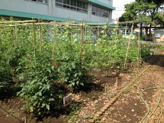 学年ごとにもっている花壇や菜園できゅうり、トマト、カボチャ、ゴーヤ、へちまを育てています。
