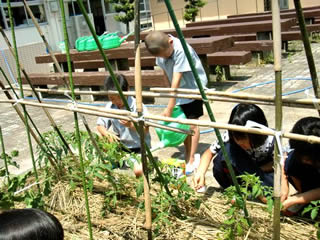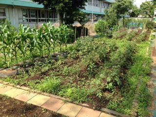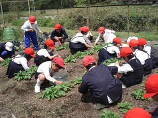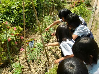 例えば、1年生がヒヤシンス・朝顔・落花生・サツマイモで6年生にピーナッツクッキーを作ってプレゼントします。2年生とおいもパーティーし、2年生がトマト・きゅうり・ナス・ミズナ・ミニトマト・ピーマンを栽培しピザパーティーをします。他の学年でヒマワリ・ホウセンカ・オクラ・ゴーヤ・インゲン豆・マリーゴールド・サルビア・ペチュニアを花壇に植えています。