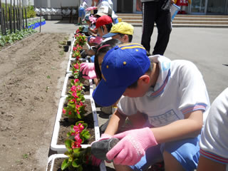 花壇については、直接花を植えることの外に、子どもたちが各自責任をもって世話をしやすいように一人一プランターにして苗植え、草取り、水やりをしています。また、苗を植えるときには、全校児童83名なので、12の縦割り班で、上学年児童が下学年児童の世話をしながら行えるようにし、子ども同士の触れ合いも大切にしています。