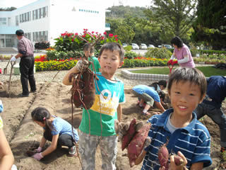 菜の花、パンジー、ビオラ、サルビア、マリーゴールドなど四季が味わえる花々を栽培したり、ジャガイモ、さつまいもなどの野菜づくりに全校で取り組み、栽培の楽しさ、収穫の楽しさを体験できるようにしています。