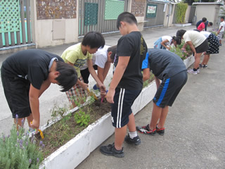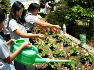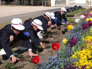 運動会前や文化祭前など、行事に合わせて、また季節ごとに植えかえや整備をしています。 植物を植えることで子どもたちが季節を、花を楽しむことができます。