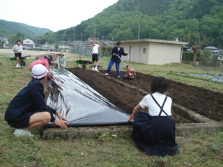 飼育栽培委員のこどもたちがサツマイモ畑の準備をしているところです。
