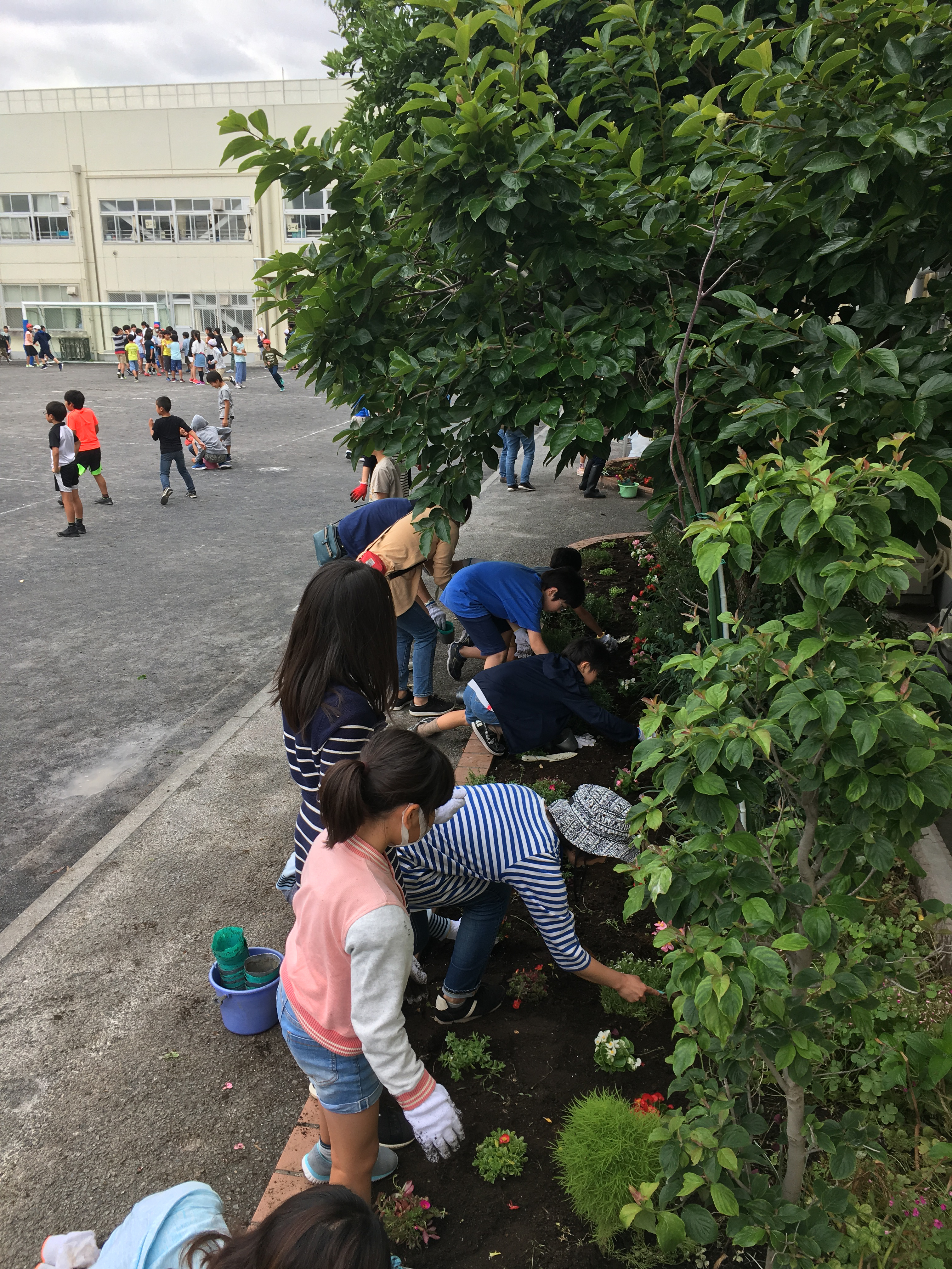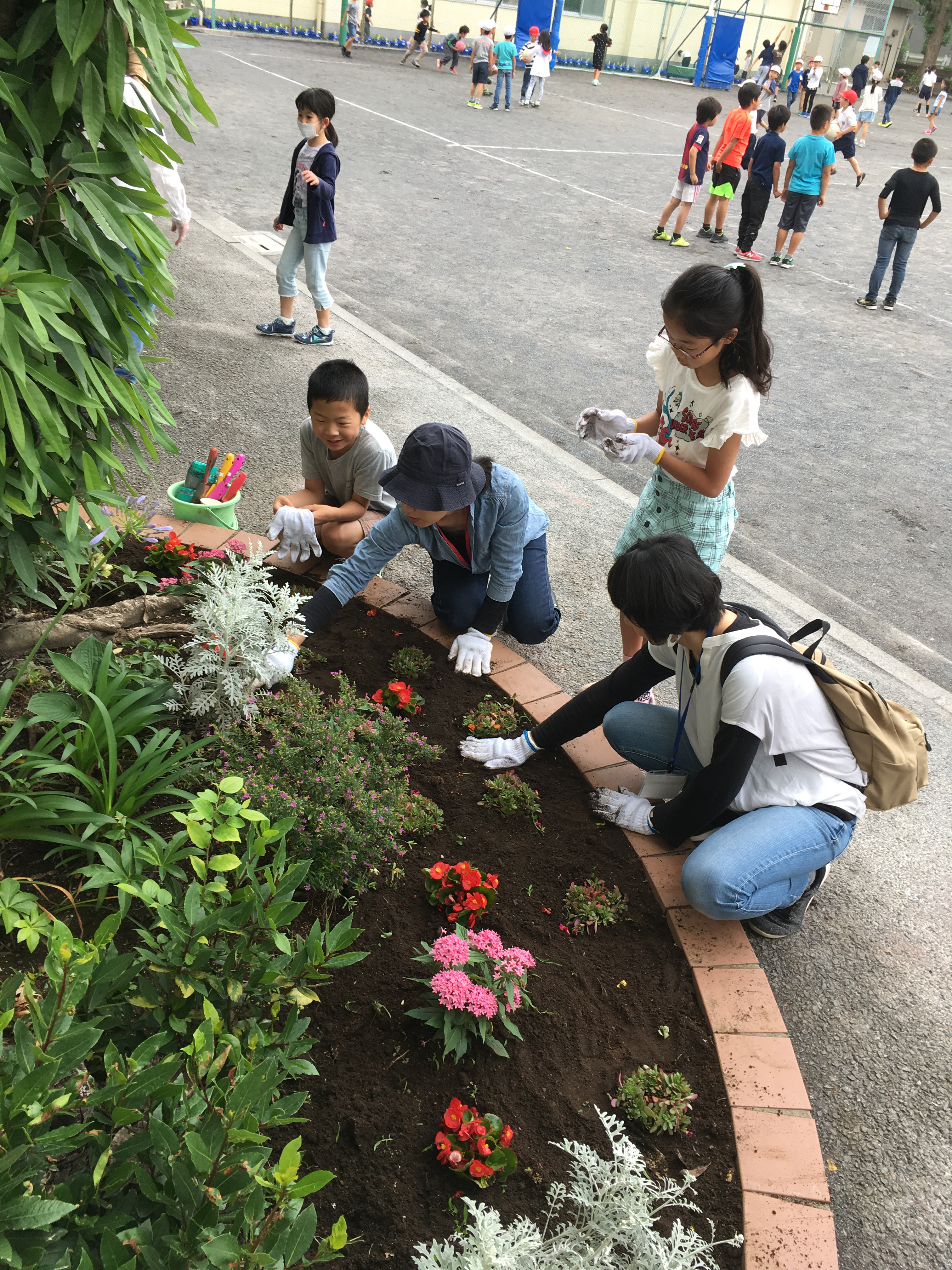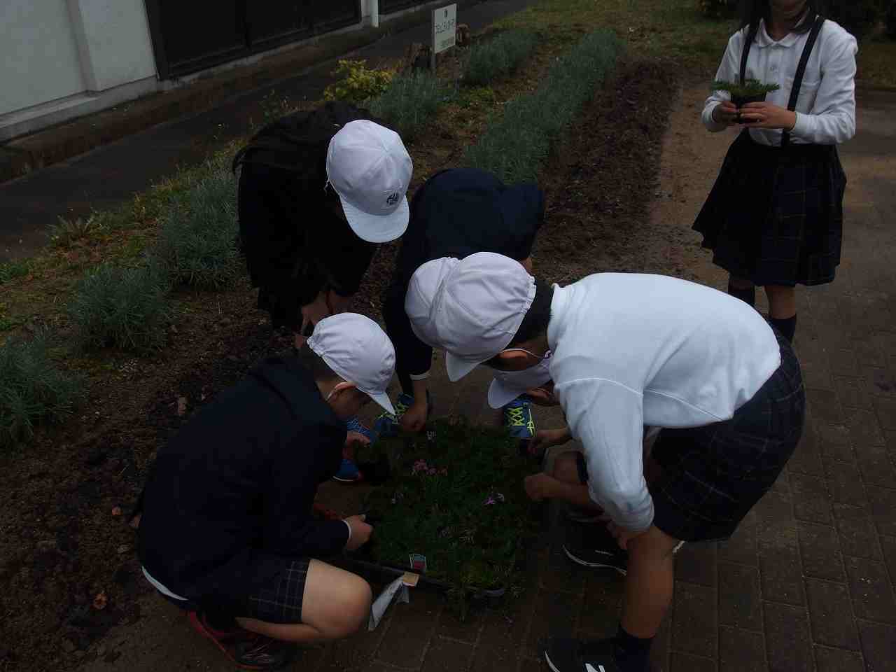 ボランティアの皆さんに教えてもらいながら、児童が中休みに植える作業を行いました。