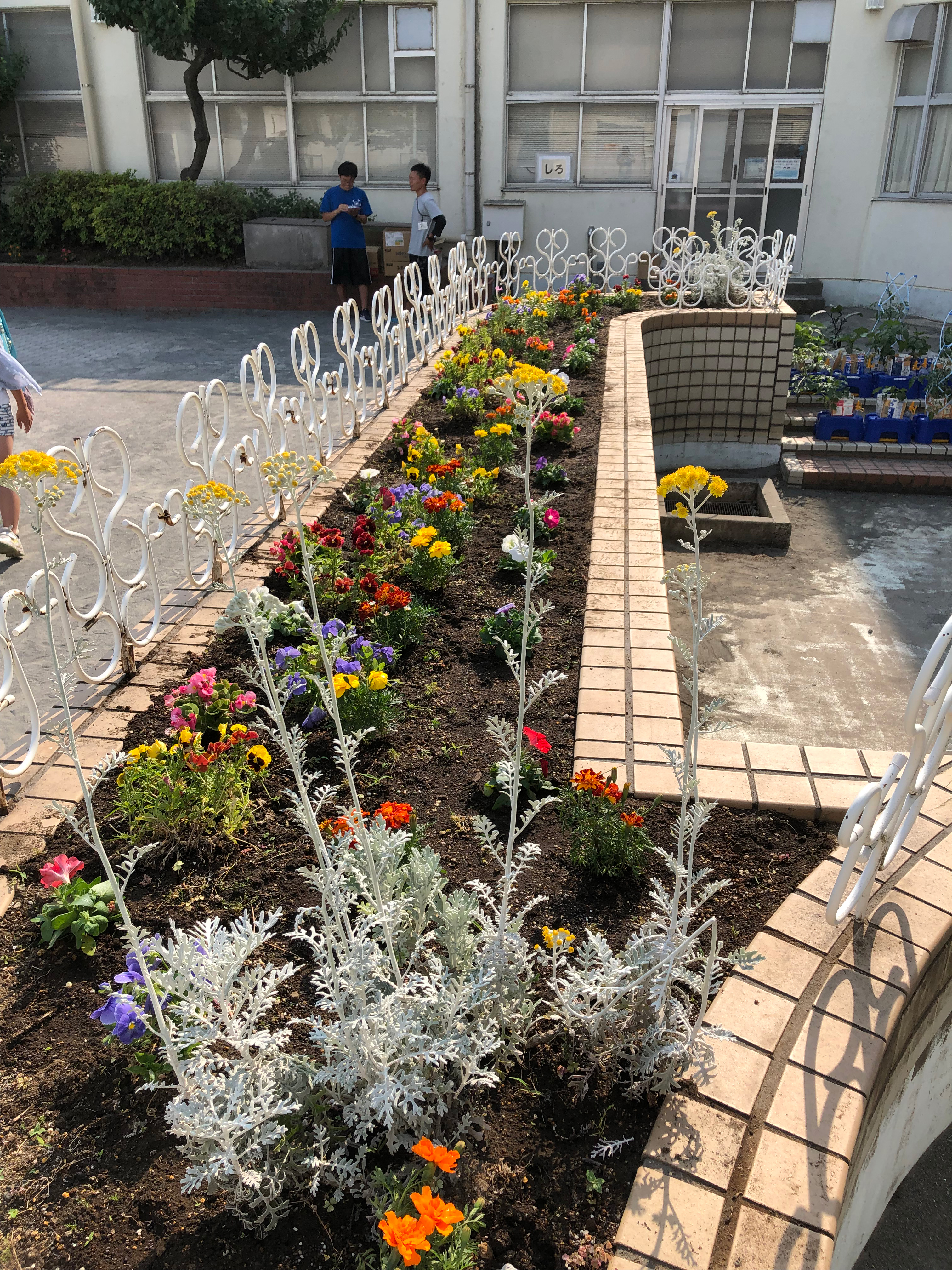 校庭にある花壇は人が沢山通るので、色と場所を考えて植える。