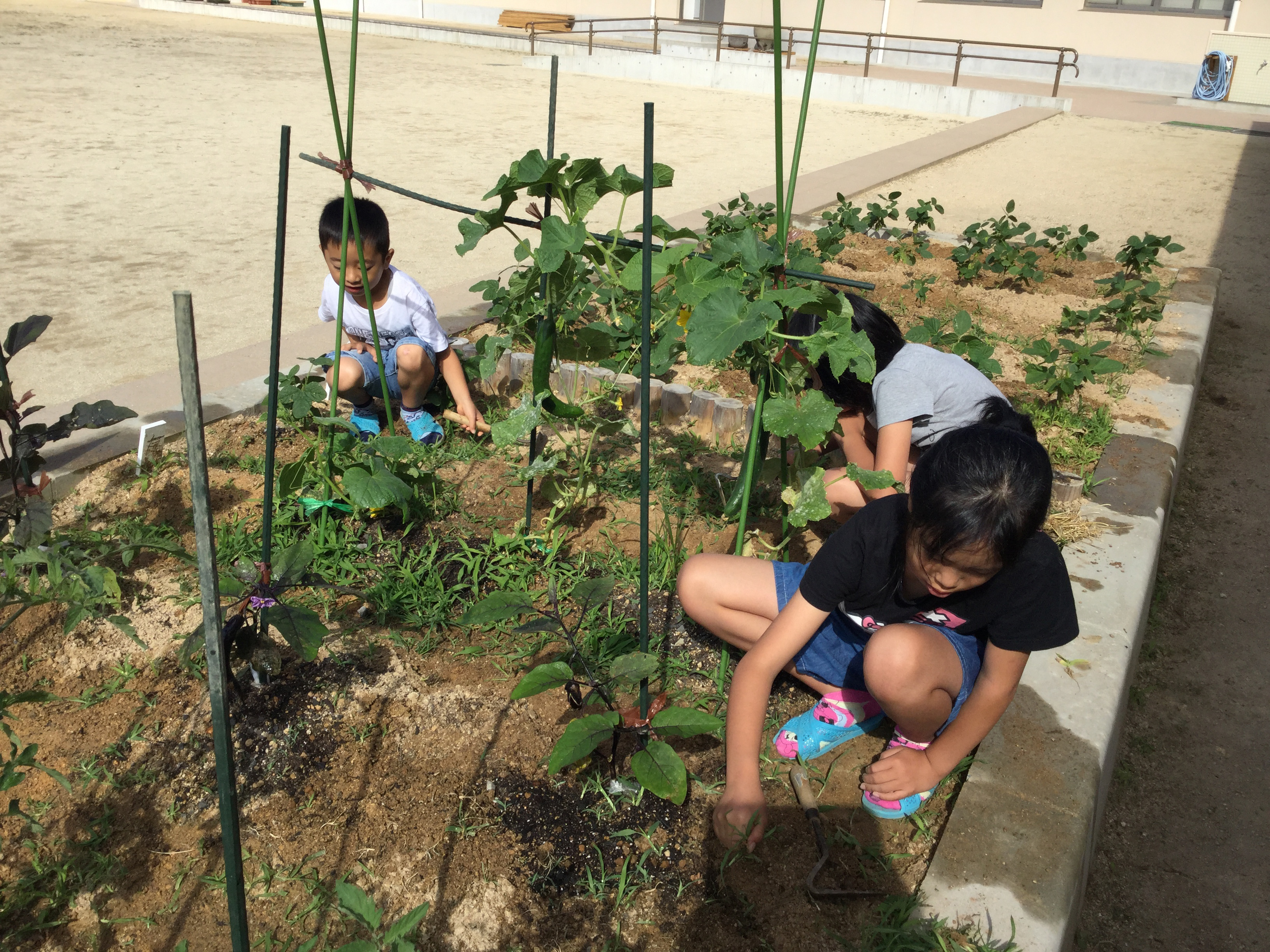 校庭や教室で学年ごとにもっている花壇や菜園は、児童と先生が一緒に管理しています。時々病気になったりして困ることもあります。野菜は、学級で育て、収穫したらみんなで食べます。これからは、トウモロコシ・トマトなども栽培していきたいです。