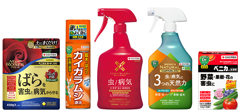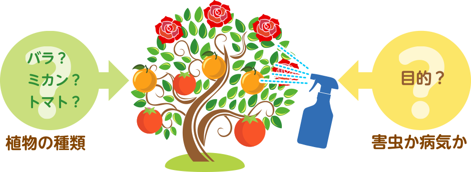 薬剤を選ぶ時のポイントをまとめました。植物の種類や薬剤を散布する場所や状況を考えて選びます。
