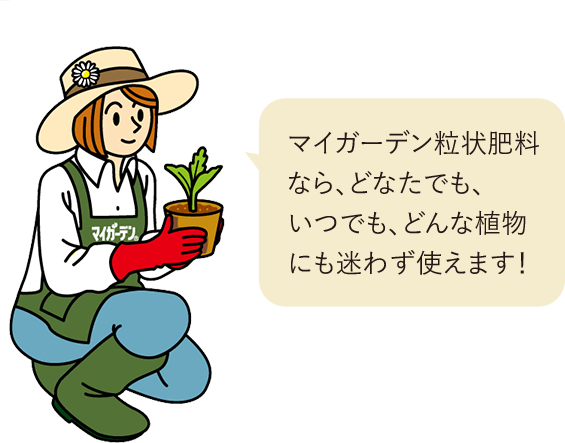 元肥にも追肥にも使えるうえ、植物の⽣育に合わせてムダなく⻑く効く。(リリースコントロールテクノロジー)