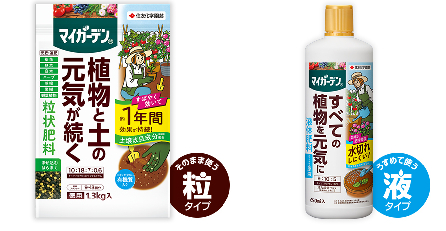 16 / 17粒状肥料どちらもガーデニング をしている人のイラストが入っていて、親近感があると思います。また、植物を元気にするというネーミングも手にしたときに惹かれる言葉だと思います。