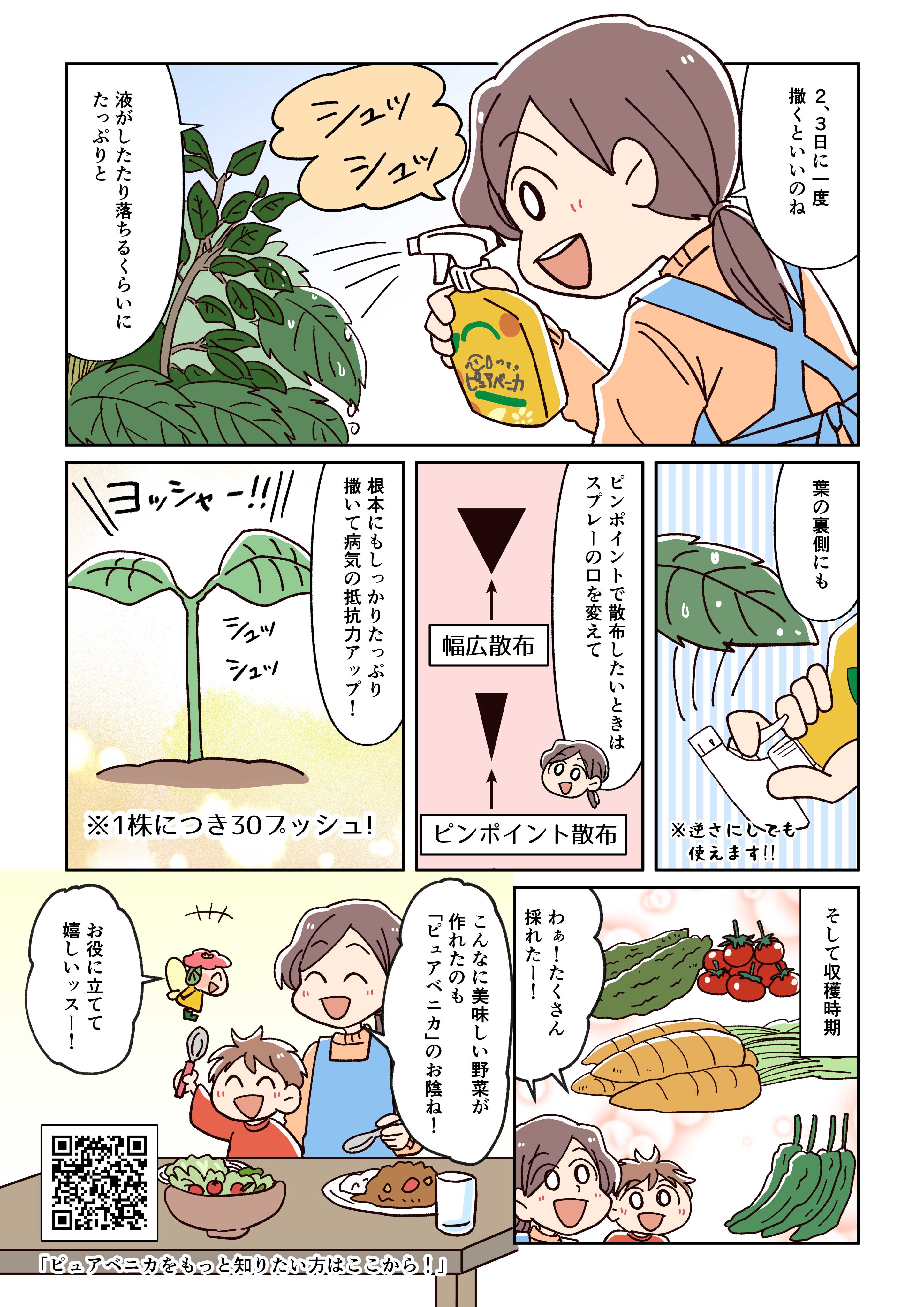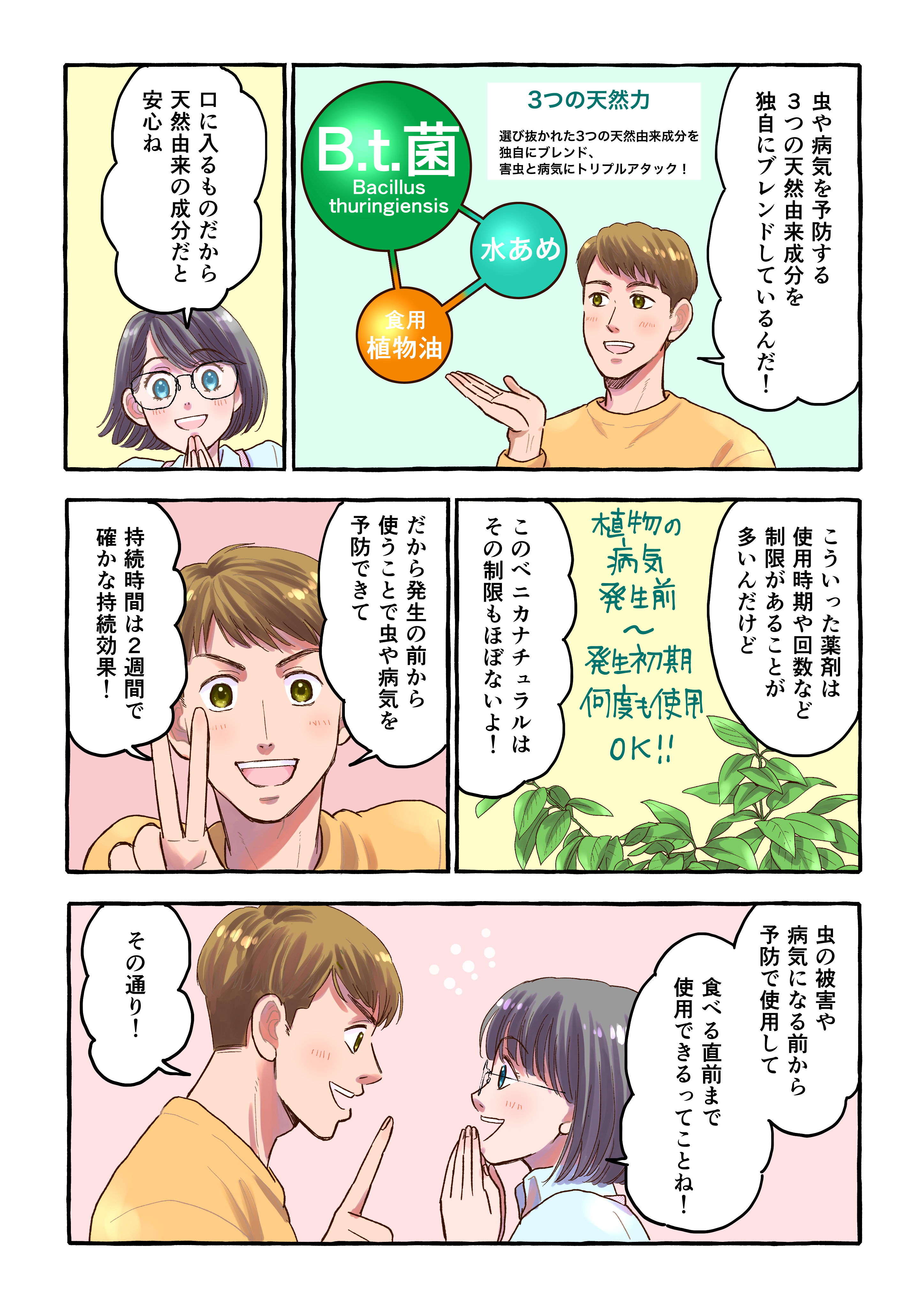 国内初!※スプレー化したB.t.菌の力で、アオムシ・ヨウトムシの食害を停止。その効果は約2週間持続します。