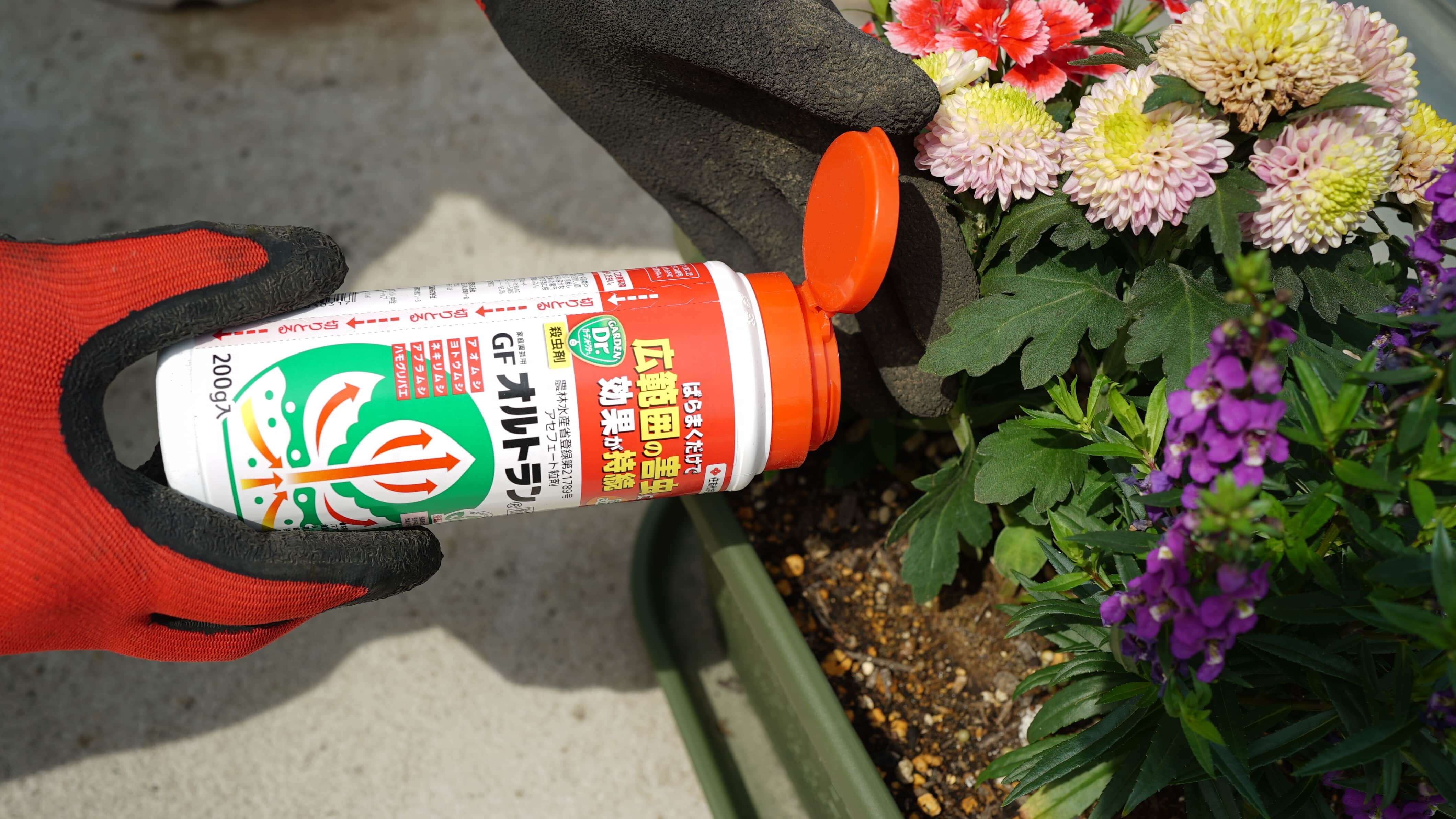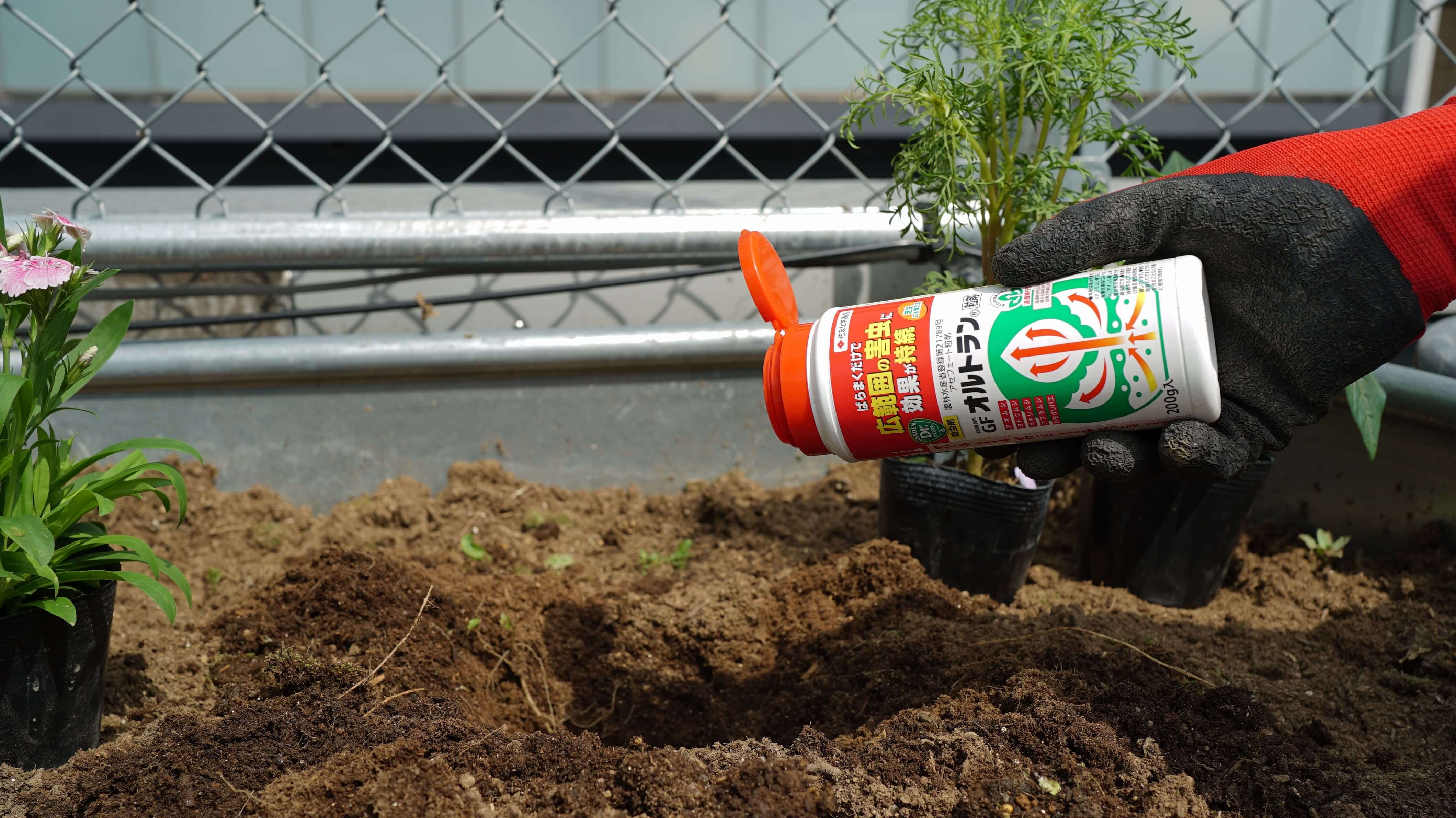 家庭園芸用GFオルトラン粒剤の使い方は簡単。苗を植え付ける際に、土の中に適量を混ぜ込むだけです。