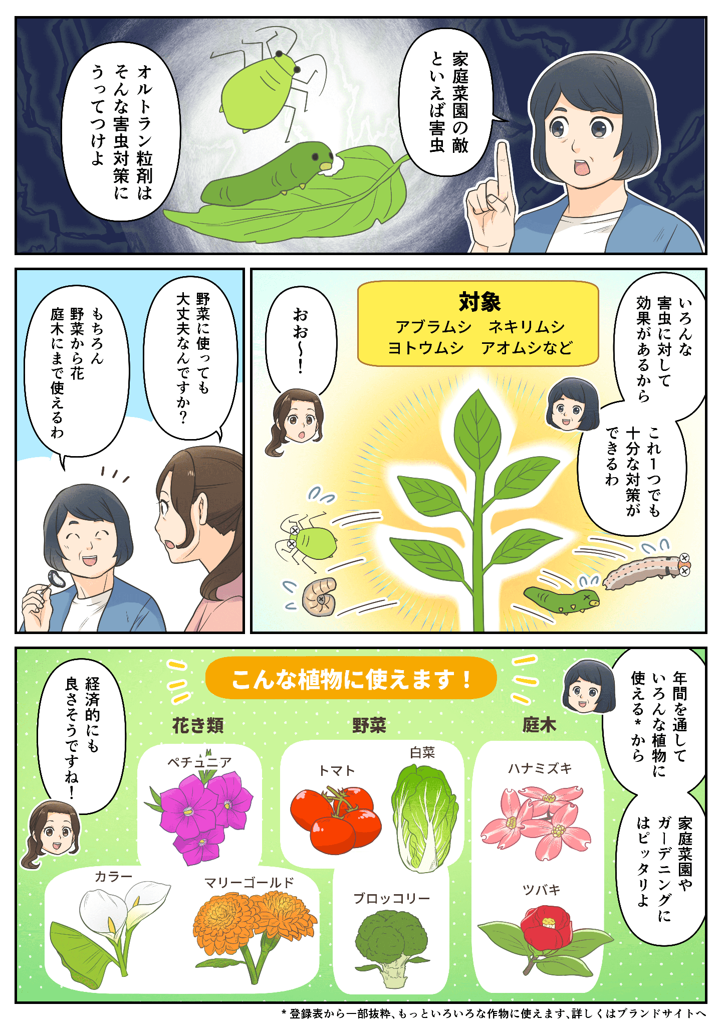 オルトラン粒剤は秋冬野菜・夏野菜・葉もの野菜・根菜・芋・豆など、家庭菜園で人気の野菜や、花壇を彩る草花、室内外の鉢植え観葉植物、庭を一面おおう芝生など、幅広い植物に効果を発揮します。