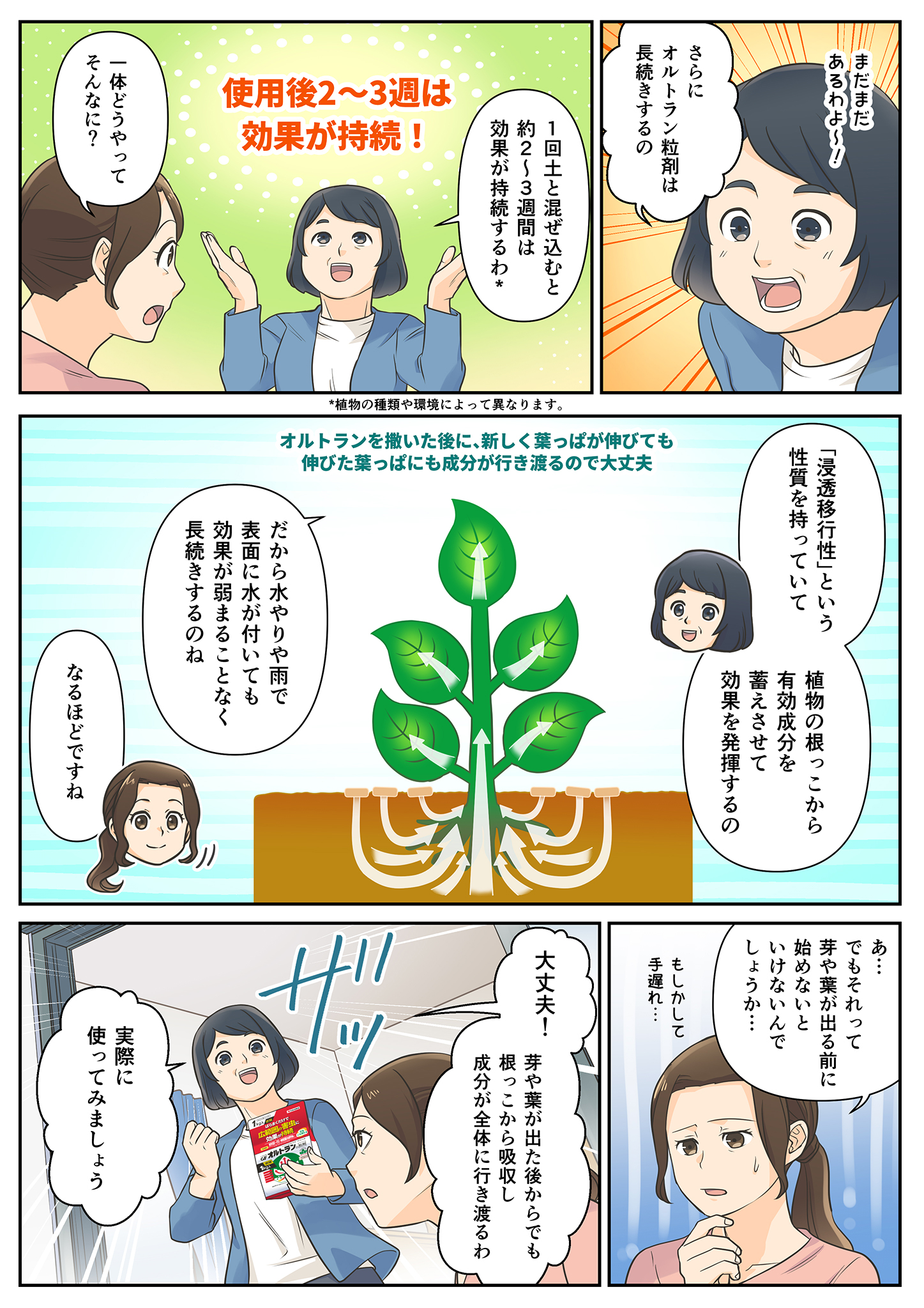 - 植物全体に殺虫成分がいきわたる「浸透移行性」で長く効果が続く