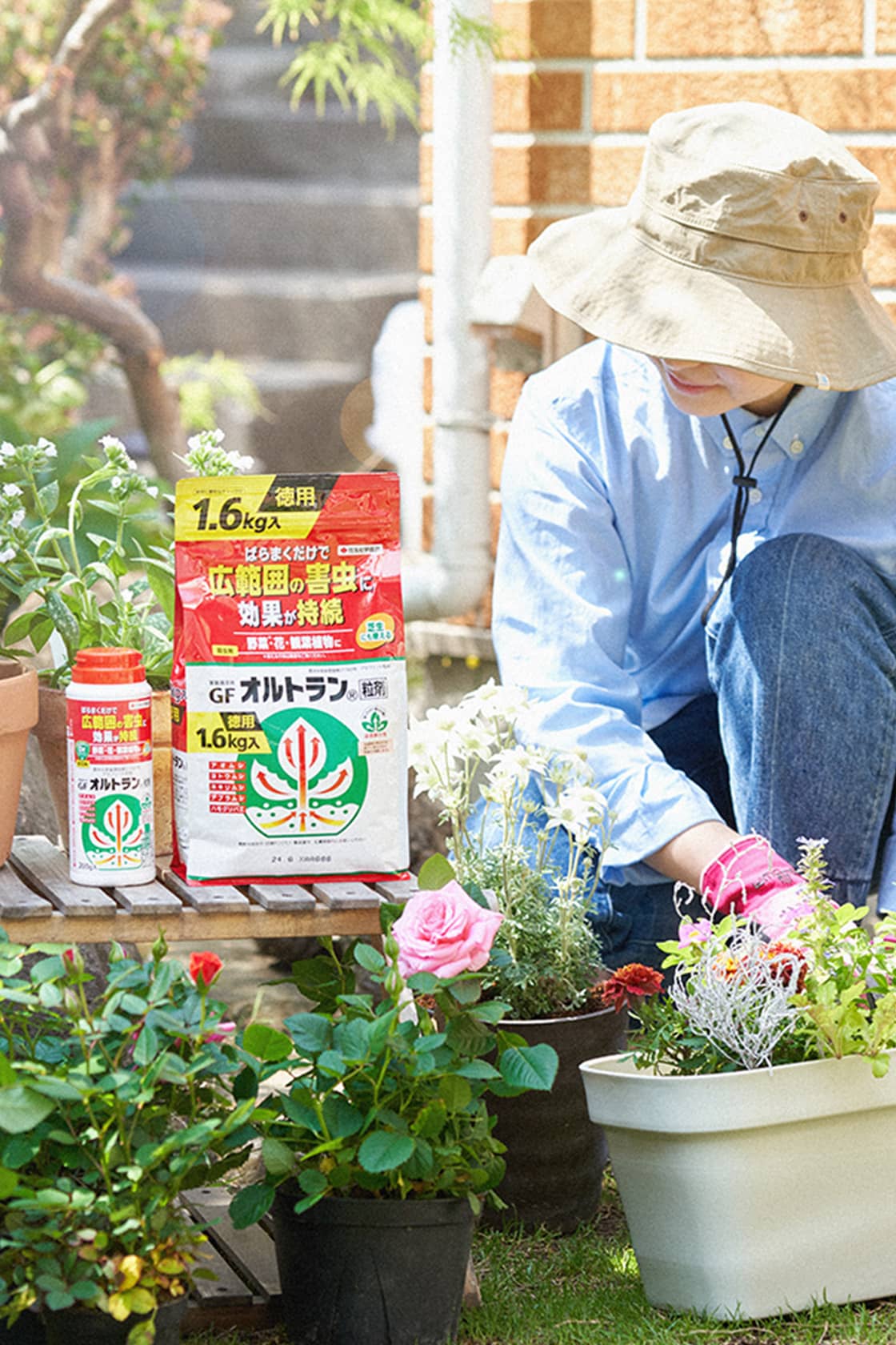 花や野菜の害虫を、簡単に長く予防・退治してくれる大定番の殺虫剤「家庭園芸用GFオルトラン粒剤」。園芸愛好家から長く支持されている理由は、ばらまくだけの簡単便利な使い方と、広範囲に長く効果が持続する点。苗を植える前に「家庭園芸用GFオルトラン粒剤」を混ぜ込めば、害虫に遭遇する確率がぐっと低くなりますよ。