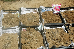 具体的な手法としては、草刈りをした後、ホームセンター等で販売用に使う草花の苗を置くトレイに新聞紙を敷き、そこに土を入れて花の種を播き、ある程度育てたものを、そのままトレイごと草刈りをした堰堤に並べていこうというのがこのプロジェクトの構想です。
