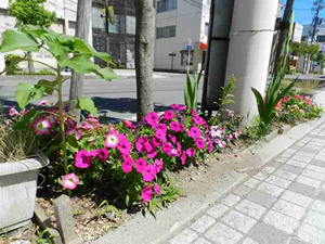 石巻市が管理している町内の街路樹の脇に、花壇として草花を植えて、町内の通りを明るくしています。 高い花が買えないので、春は水仙、その後はペチュニア、コスモス等なるべく長く咲く花を買い求めて育てています。昨年いただいた肥料をまいて花々を育てたところ、前年より格段に色つやが良く育ったので、他所から石巻市内に来てくれた人を、今年も幾らかでも花でおもてなししたいと考えております。