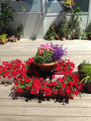 花:サフィニア・マックス、サンパチェンス、ジャンボひまわり、芝桜など。