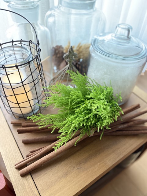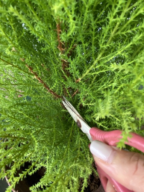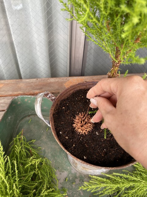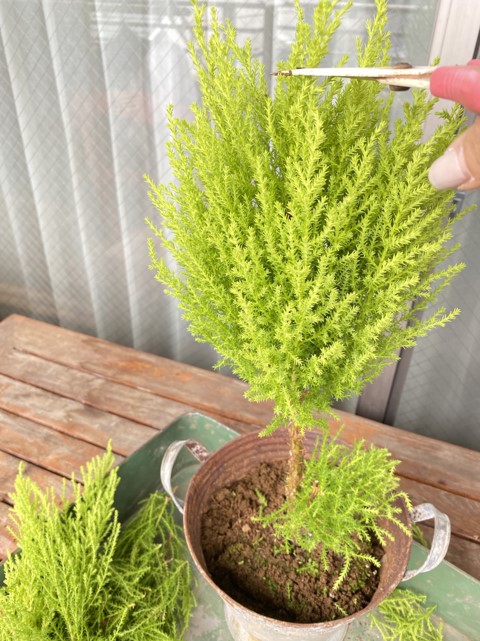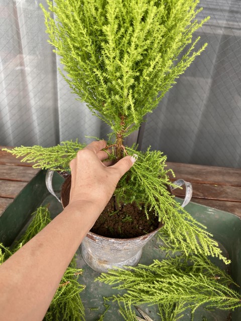 切ったゴールドクレストの枝は、とっても良い香りなので、切り口を揃えてブーケのようにまとめてお部屋に飾ると、お部屋の中が良い香りになるよ!