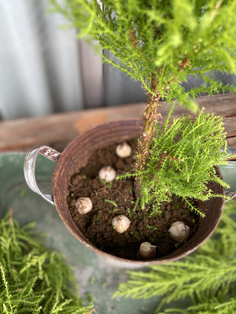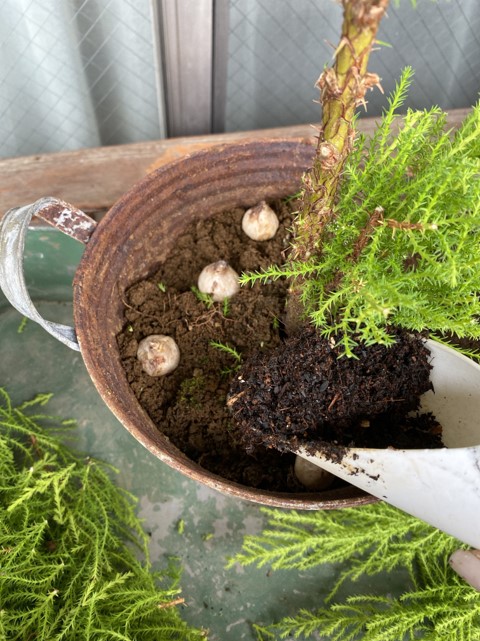 こうやって、ツリーにして楽しんで、あとから球根の小さな芽が出てきたらもっと楽しいしびっくりするでしょ?