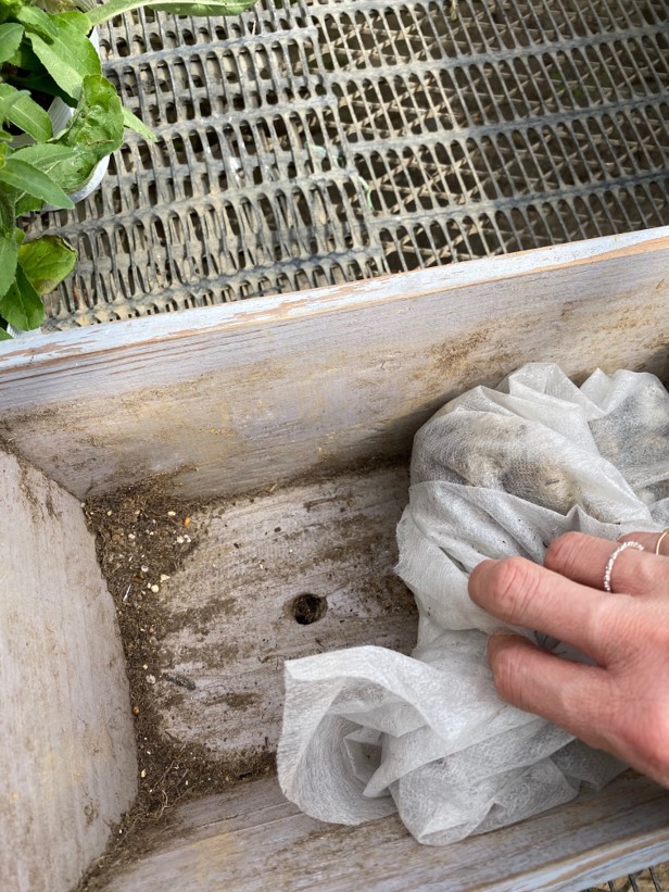 底穴を塞ぎます。虫が入ってこないことと、鉢底石が溢れなければよいので、私は不織布で底石を包んでから培養土で植えます。